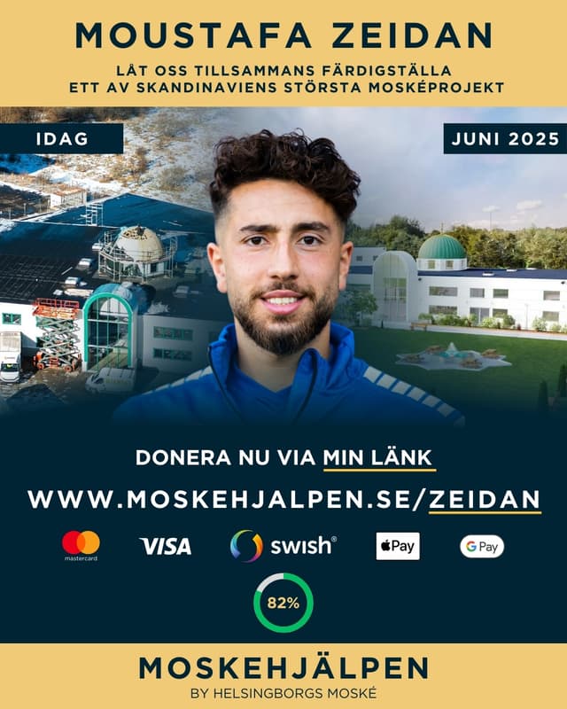 Jag vill uppmana vår fantastiska community att tillsammans sprida kärlek och omtanke under ramadan – en tid för reflektion och goda handlingar. I Helsingborg har den lokala moskén kämpat hårt i tre år för att färdigställa sin byggnad, och nu är de bara fyra månader från att bli klara. Det här projektet är ett av Nordens största moskébyggen och kommer att bli en viktig mötesplats, särskilt för stadens unga. Jag tror starkt på att vi kan åstadkomma något stort när vi står enade. Mitt mål är att vi tillsammans samlar in 30 000 kr – vill du vara med och hjälpa till? Du som donerar högst belopp kommer få en signerad tröja skickad hem av mig. /Taha Ali